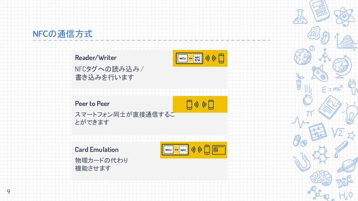 出典 • NFC Everywhere https://www.nxp.com/docs/ja/brochure/NFC-EVERYWHERE-BR.pdf • NFCの概要と特徴 https://artfinex.co.jp/wp/wp-content/themes/artfinex/data/rfid/05 .pdf •