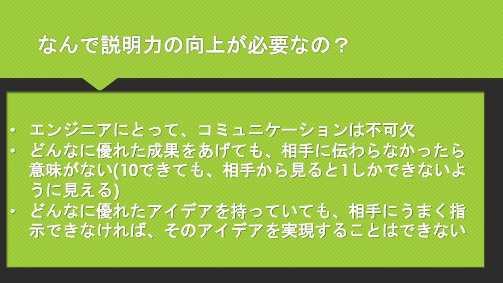 なんで説明力の向上が必要なの? • エンジニアにとって、コミュニケーションは不可欠 • どんなに優れた成果をあげても、相手に伝わらなかったら 意味がない(10できても、相手から見ると1しかできないよ うに見える) • どんなに優れたアイデアを持っていても、相手にうまく指 示できなければ、そのアイデアを実現することはできない
