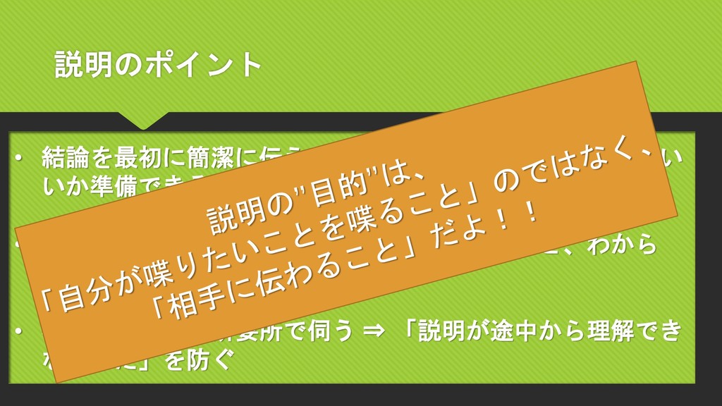 説明のポイント • 結論を最初に簡潔に伝える ⇒ 相手が何を軸に話を聞けばい いか準備できる • 相手が理解できそうな言葉を選ぶ ⇒ 「なるほど、わから