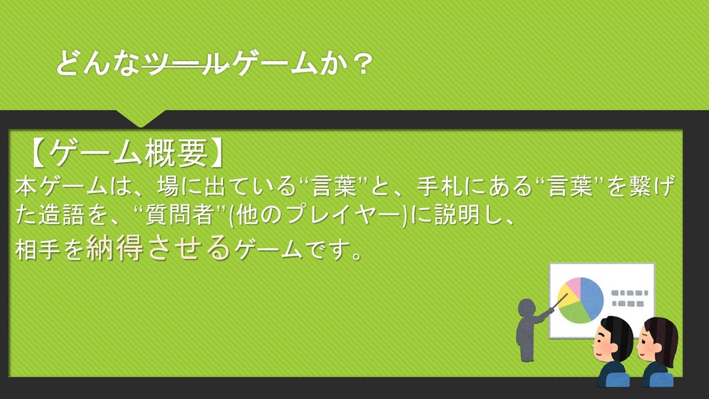 どんなツールゲームか? 【ゲーム概要】 本ゲームは、場に出ている“言葉”と、手札にある“言葉”を繋げ た造語を、“質問者”(他のプレイヤー)に説明し、 相手を納得させるゲームです。