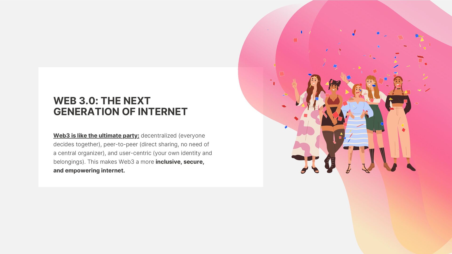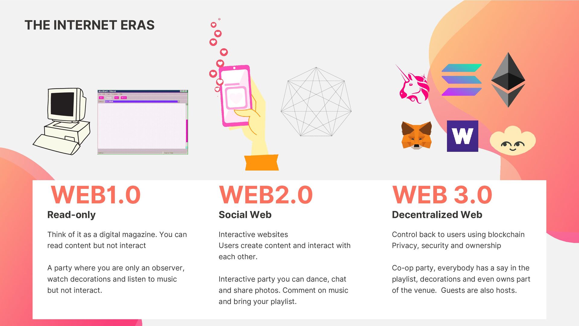 Now, fasten your seatbelts for the thrilling ride into Web 3.0, the Decentralized Web, where the power is back in our hands, thanks to blockchain technology. Picture a dreamy party where everyone has a say in the playlist, décor, and even owns a piece of the venue! Guests are also the hosts, shaping the digital landscape together.