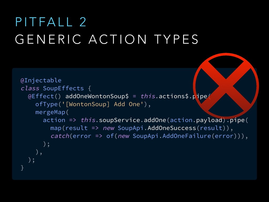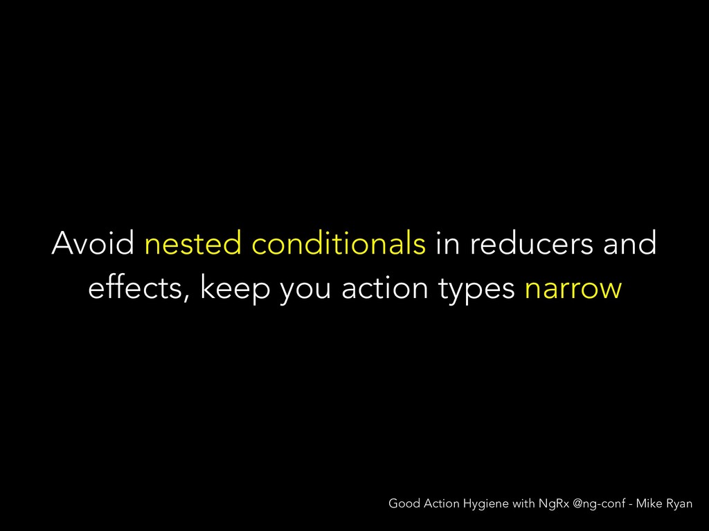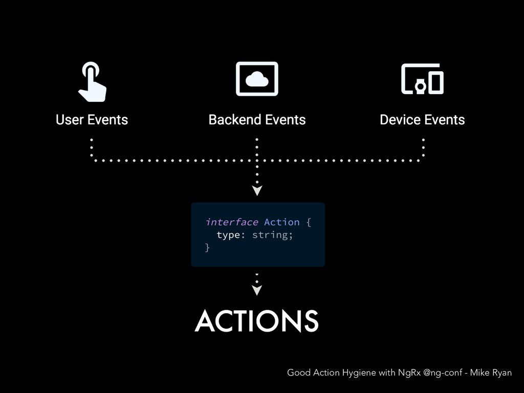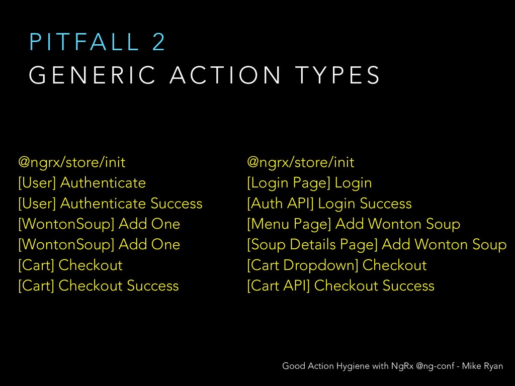N E R I C A C T I O N T Y P E S @ngrx/store/init [User] Authenticate [User] Authenticate Success [WontonSoup] Add One [WontonSoup] Add One [Cart] Checkout [Cart] Checkout Success @ngrx/store/init [Login Page] Login [Auth API] Login Success [Menu Page] Add Wonton Soup [Soup Details Page] Add Wonton Soup [Cart Dropdown] Checkout [Cart API] Checkout Success Good Action Hygiene with NgRx @ng-conf - Mike Ryan