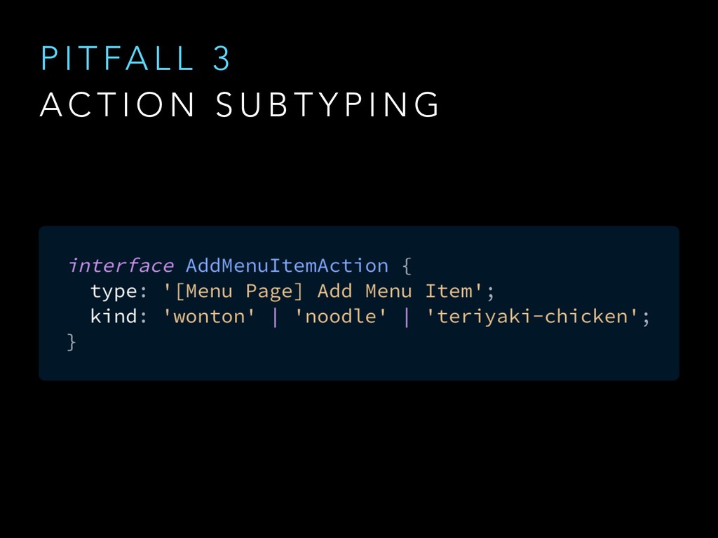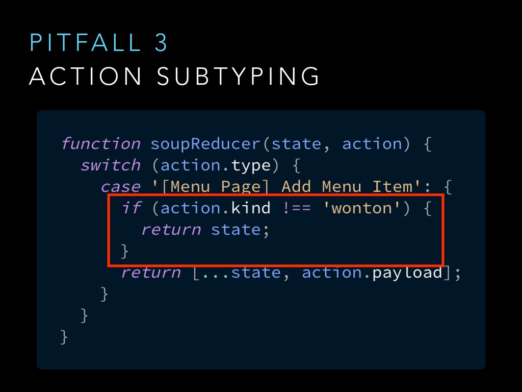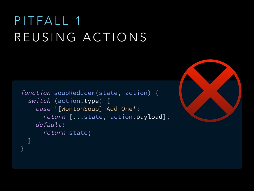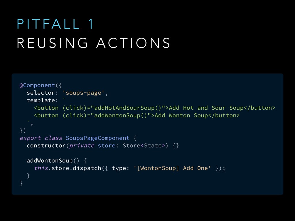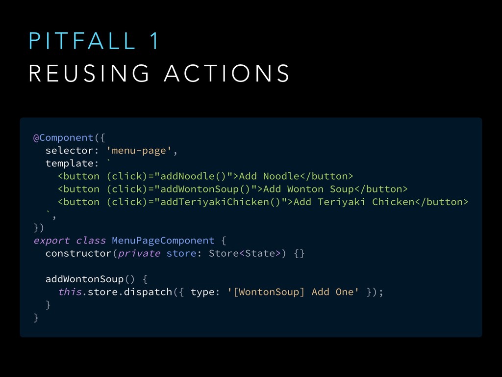 N E R I C A C T I O N T Y P E S @ngrx/store/init [User] Authenticate [User] Authenticate Success [WontonSoup] Add One [WontonSoup] Add One [Cart] Checkout [Cart] Checkout Success @ngrx/store/init [Login Page] Login [Auth API] Login Success [Menu Page] Add Wonton Soup [Soup Details Page] Add Wonton Soup [Cart Dropdown] Checkout [Cart API] Checkout Success Good Action Hygiene with NgRx @ng-conf - Mike Ryan