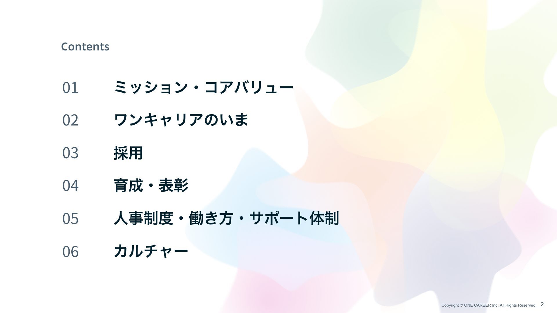 0 4 ҭɾදজ 0 5 ਓࣄ੍ɾಇ͖ํɾαϙʔτମ੍ 0 6 Χϧνϟʔ Copyright © ONE CAREER Inc. All Rights Reserved. 2 2