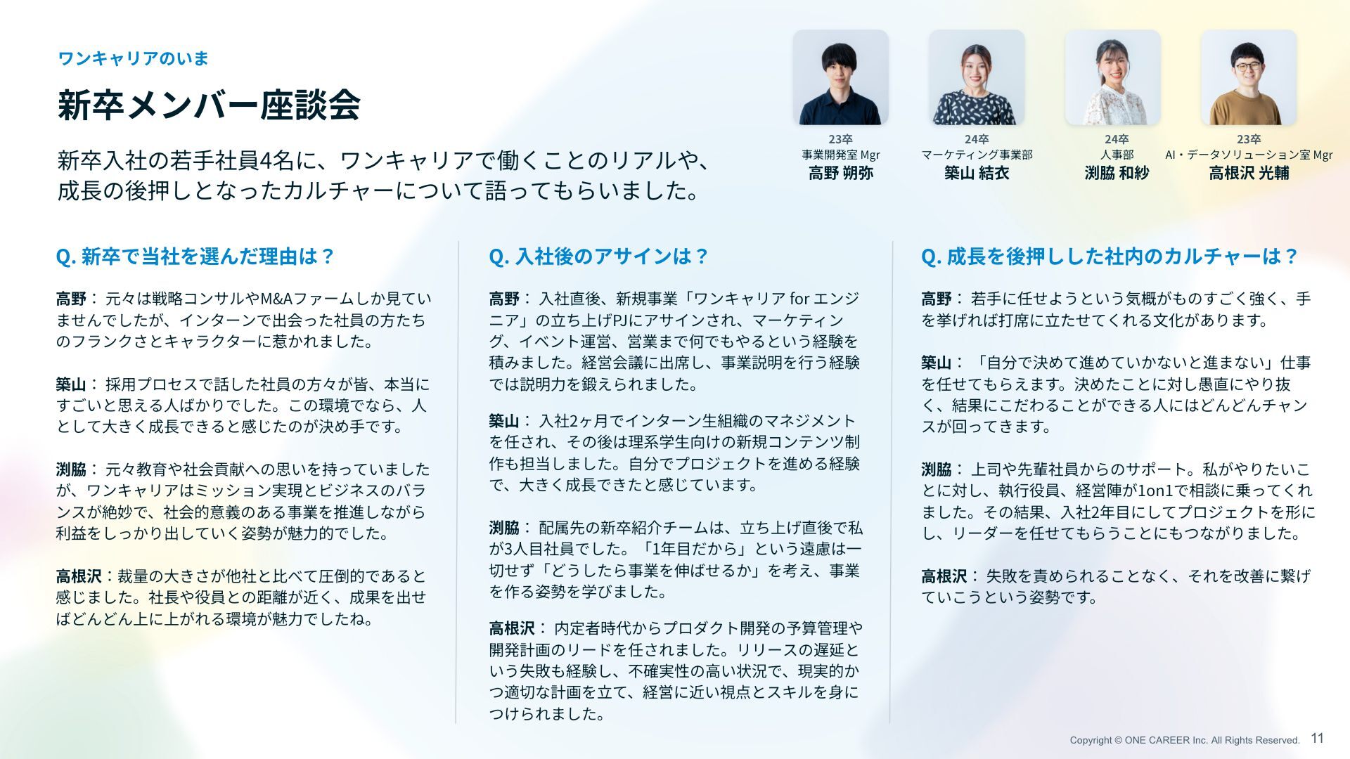 Copyright © ONE CAREER Inc. All Rights Reserved. 新卒メンバー座談会 11