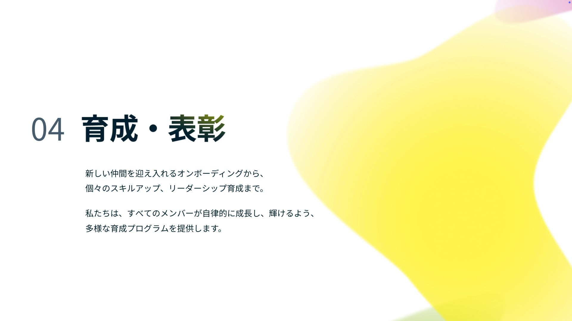 0 4 新しい仲間を迎え 入 れるオンボーディングから、 個々のスキルアップ、リーダーシップ育成まで。 私たちは、すべてのメンバーが 自 律的に成 長