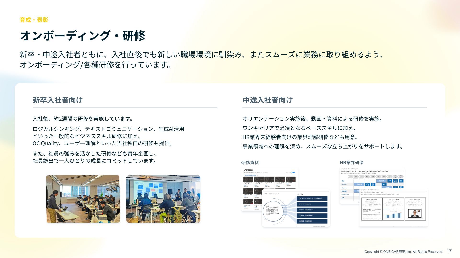 研修 17 育成 ・ 表彰 新卒 ・ 中途 入 社者ともに、 入 社直後でも新しい職場環境に馴染み、またスムーズに業務に取り組めるよう、 オンボーディング/各種研修を 行 っています。 新卒 入 社者向け 中途 入 社者向け 入 社後、約2週間の研修を実施しています。 ロジカルシンキング、テキストコミュニケーション、 生 成AI活 用 といった 一 般的なビジネススキル研修に加え、 OC Quality、ユーザー理解といった当社独 自 の研修も提供。 また、社員の強みを活かした研修なども毎年企画し、 社員総出で 一人 ひとりの成 長 にコミットしています。 オリエンテーション実施後、動画 ・ 資料による研修を実施。 ワンキャリアで必須となるベーススキルの他、 HR業界未経験者向けの業界理解研修なども 用 意。 ワンキャリアの事業領域への理解を深めていただきます。 ݚमࢿྉ HRۀքݚम