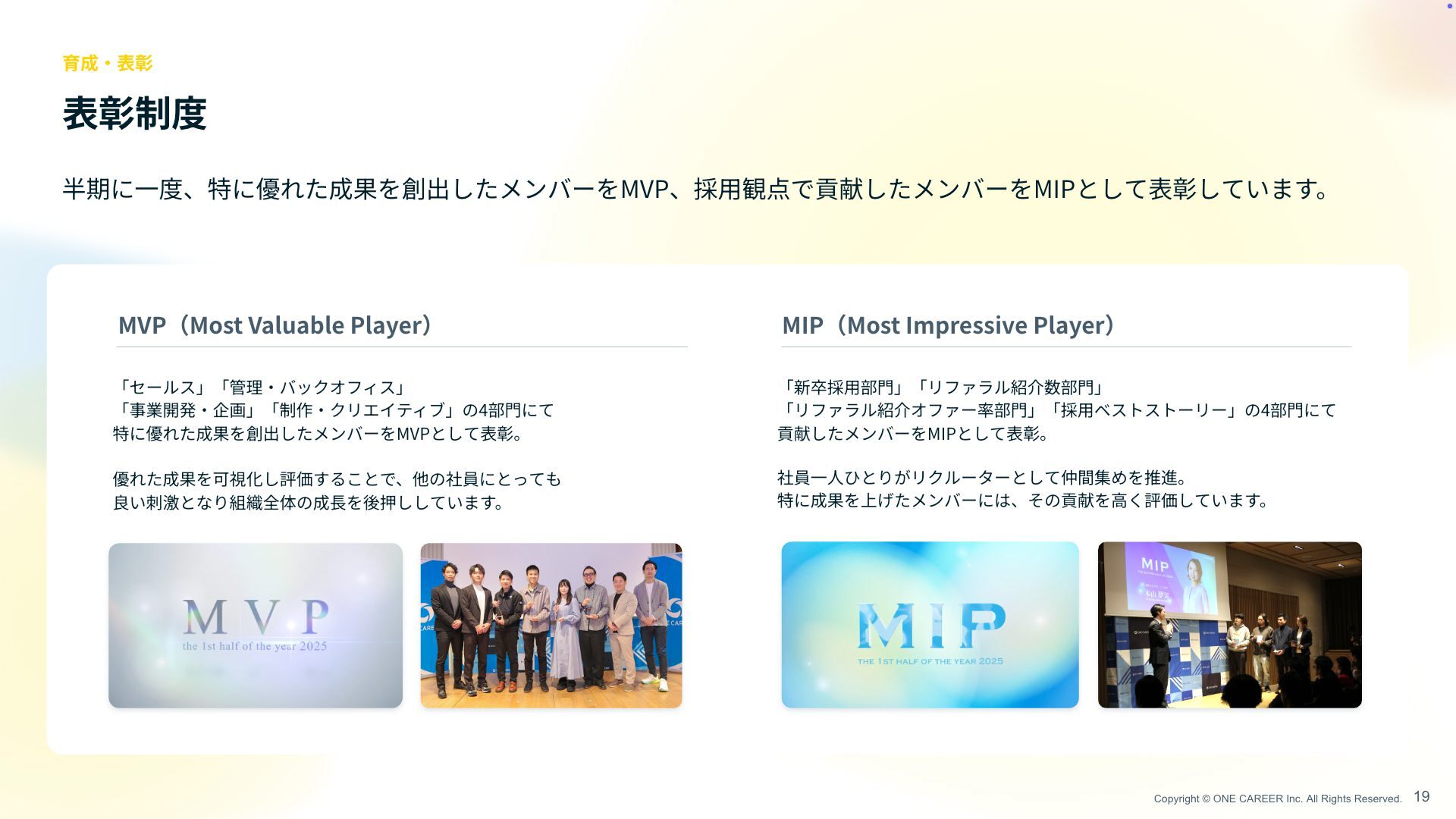 一 度、特に優れた成果を創出したメンバーをMVP、採 用 観点で貢献したメンバーをMIPとして表彰しています。 表彰制度 育成 ・ 表彰 MVP(Most Valuable Player) MIP(Most Impressive Player) 「セールス」「管理 ・ バックオフィス」 「事業開発 ・ 企画」「制作 ・ クリエイティブ」の4部 門 にて 特に優れた成果を創出したメンバーをMVPとして表彰。 優れた成果を可視化し評価することで、他の社員にとっても 良い刺激となり組織全体の成 長 を後押ししています。 「新卒採 用 部 門 」「リファラル紹介数部 門 」 「リファラル紹介オファー率部 門 」「採 用 ベストストーリー」の4部 門 にて 貢献したメンバーをMIPとして表彰。 社員 一人 ひとりがリクルーターとして仲間集めを推進。 特に成果を上げたメンバーには、その貢献を 高 く評価しています。