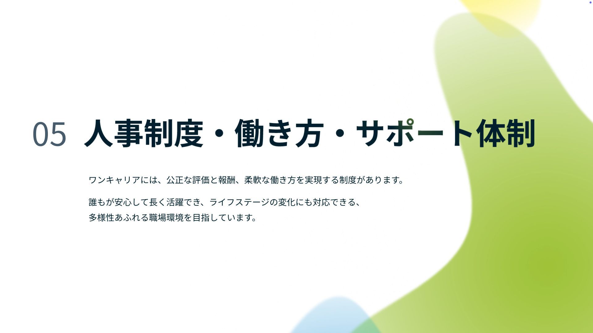 0 5 ワンキャリアには、公正な評価と報酬、柔軟な働き 方 を実現する制度があります。 誰もが安 心 して 長