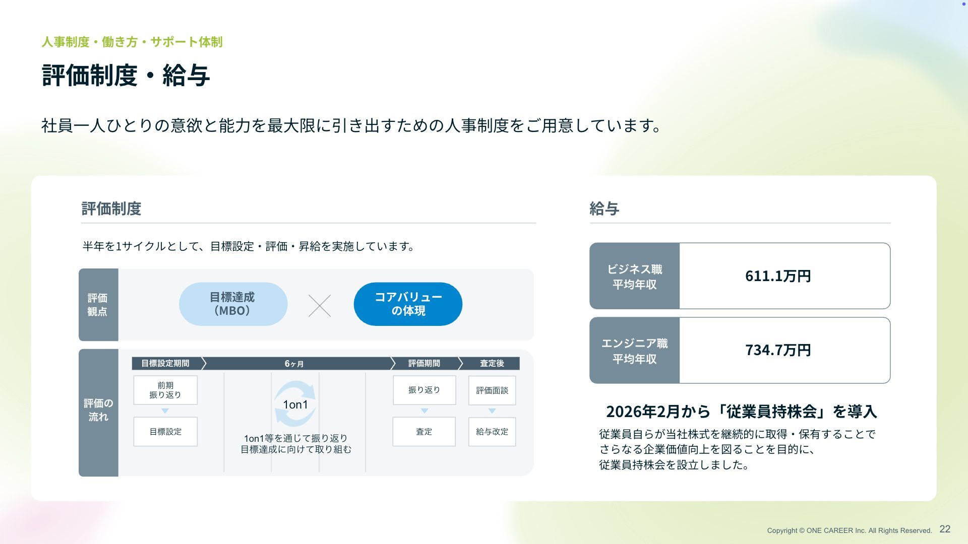 ධՁͷ ྲྀΕ 社員 一人 ひとりの意欲と能 力 を最 大 限に引き出すための 人 事制度をご 用 意しています。 評価制度 ・ 給与 22 人 事制度 ・ 働き 方 ・ サポート体制 給与 評価制度 半年を1サイクルとして、 目 標設定 ・ 評価 ・ 昇給を実施しています。 2026年2 月 から「従業員持株会」を導 入 従業員 自 らが当社株式を継続的に取得 ・ 保有することで さらなる企業価値向上を図ることを 目 的に、 従業員持株会を設 立 しました。 611.1万円 Ϗδωε৬ ฏۉऩ 734.7万円 ΤϯδχΞ৬ ฏۉऩ 1on1Λ௨ͯ͡ৼΓฦΓ ඪୡʹ͚ͯऔΓΉ ࠪఆ ৼΓฦΓ ධՁ໘ஊ څ༩վఆ 6ϲ݄ 1on1 ධՁظؒ ࠪఆޙ ඪઃఆ લظ ৼΓฦΓ ඪઃఆظؒ コアバリュー の体現 目 標達成 (MBO)