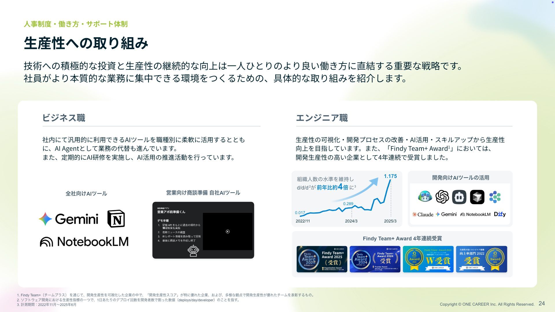 生 産性の継続的な向上は 一 人 ひとりのより良い働き 方 に直結する重要な戦略です。 社員がより本質的な業務に集中できる環境をつくるための、具体的な取り組みを紹介します。 生 産性への取り組み 人 事制度 ・ 働き 方・ サポート体制 ビジネス職 エンジニア職 社内にて汎 用 的に利 用 できるAIツールを職種別に柔軟に活 用 するととも に、AI Agentとして業務の代替も進んでいます。 また、定期的にAI研修を実施し、AI活 用 の推進活動を 行 っています。 生 産性の可視化 ・ 開発プロセスの改善 ・ AI活 用・ スキルアップから 生 産性 向上を 目 指しています。また、「Findy Team+ Award 1 」においては、 開発 生 産性の 高 い企業として4年連続で受賞しました。 ৫ਓͷਫ४Λҡ࣋͠ d/d/d 2͕ લൺ 4 ഒ ʹ3 ։ൃ͚AIπʔϧͷ׆༻ શ͚ࣾAIπʔϧ Ӧۀ͚ஊ४උ ࣗࣾAIπʔϧ Findy Team+ Award 4࿈ଓड 0.017 1.175 0.289 2022/11 2024/3 2025/3 1. Findy Team+ʢνʔϜϓϥεʣ Λ௨ͯ͡ɺ։ൃੜ࢈ੑΛՄࢹԽͨ͠اۀͷதͰɺʮ։ൃੜ࢈ੑείΞʯ͕ಛʹ༏Εͨاۀɺ͓Αͼɺଟ༷ͳ؍Ͱ։ൃੜ࢈ੑ͕༏ΕͨνʔϜΛදজ͢Δͷɻ