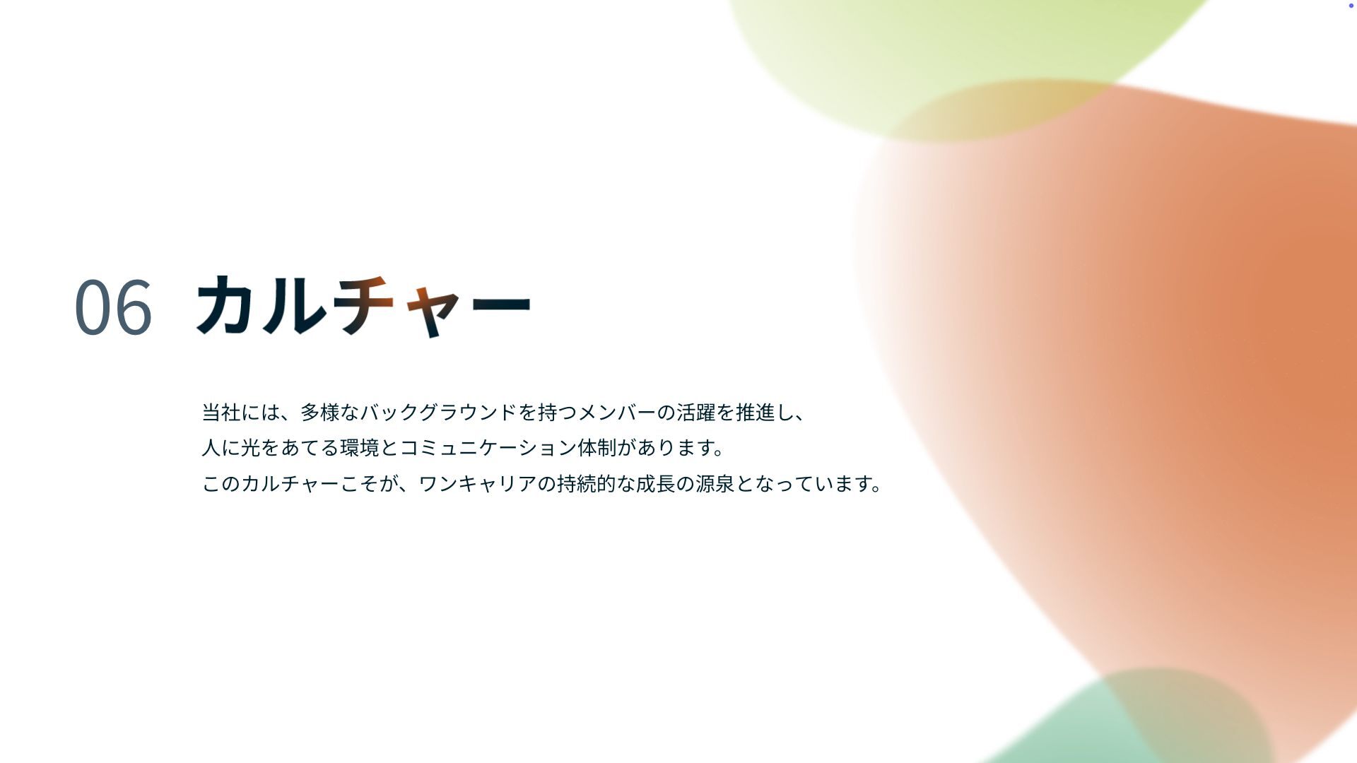 0 6 当社には、多様なバックグラウンドを持つメンバーの活躍を推進し、 人 に光をあてる環境とコミュニケーション体制があります。 このカルチャーこそが、ワンキャリアの持続的な成 長 の源泉となっています。