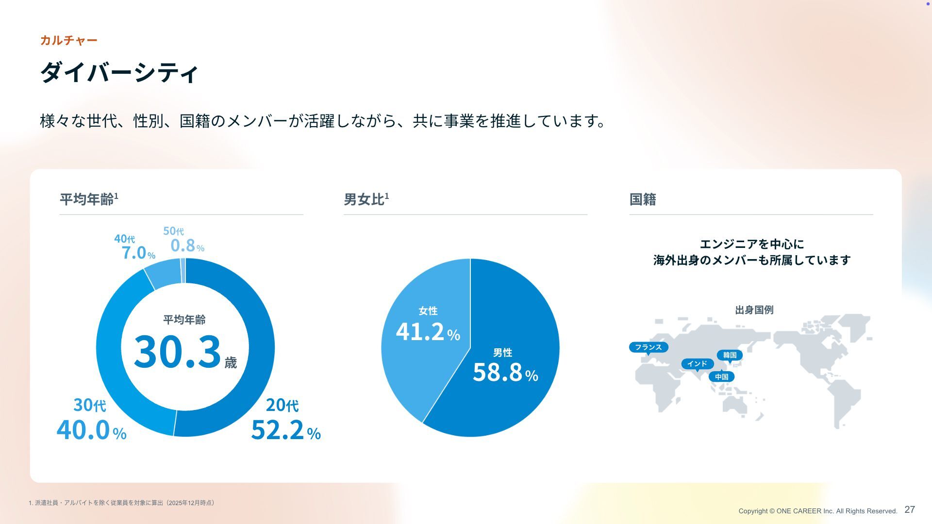 カルチャー 様々な世代、性別、国籍のメンバーが活躍しながら、共に事業を推進しています。 平均年齢 1 男 女比 1 国籍 58 . 8 % 男性 エンジニアを中 心 に 海外出 身 のメンバーも所属しています 52 . 2 % 20 代 40 . 0 % 30 代 7 . 0 % 4 0 代 0 . 8 % 5 0 代 出 身 国例 ؖࠃ தࠃ Πϯυ ϑϥϯε 30 . 3 歳 平均年齢 1. ݣࣾһɾΞϧόΠτΛআ͘ैۀһΛରʹࢉग़ʢ202512݄࣌ʣ 41 . 2 % 女 性