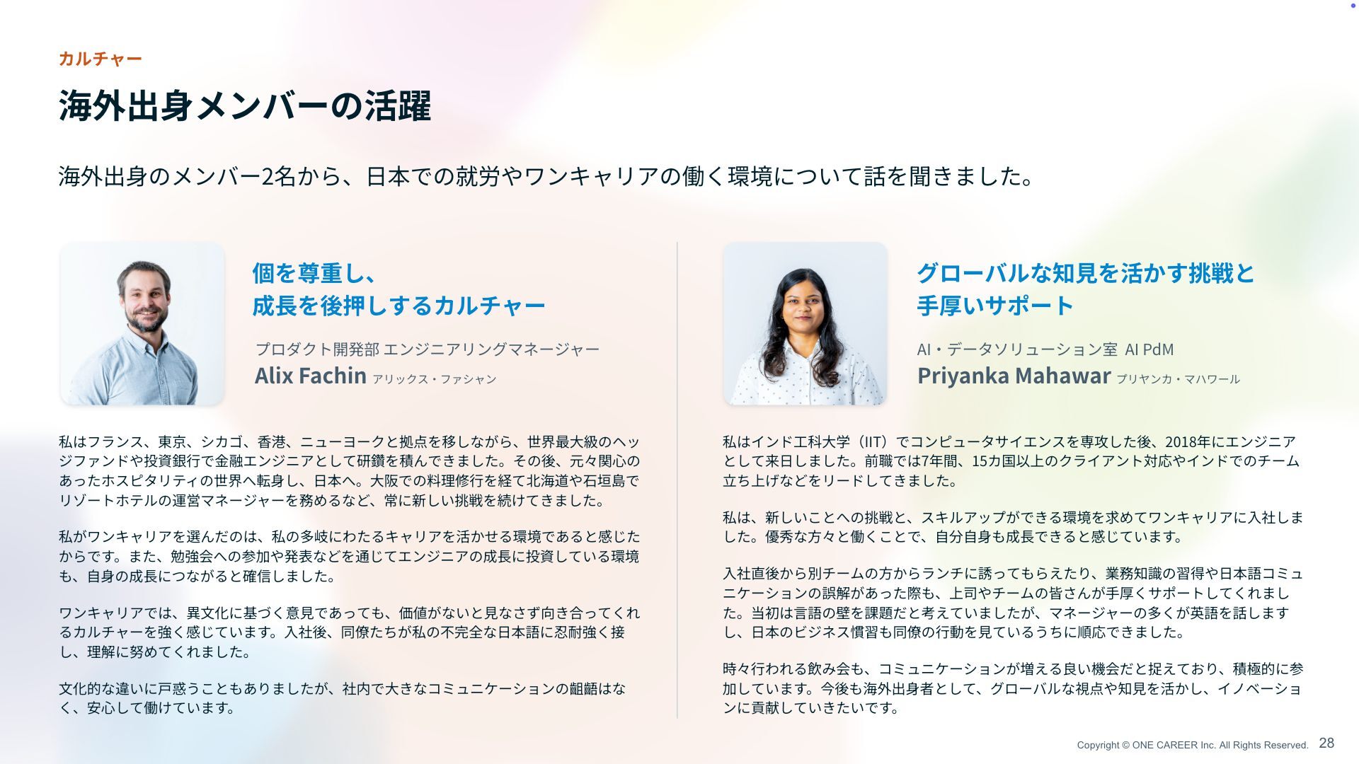 のメンバー2名から、 日 本での就労やワンキャリアの働く環境について話を聞きました。 28 カルチャー 海外出 身 メンバーの活躍 プロダクト開発部 エンジニアリングマネージャー Alix Fachin アリックス ・ ファシャン AI ・ データソリューション室 AI PdM Priyanka Mahawar プリヤンカ ・ マハワール 個を尊重し、 成 長 を後押しするカルチャー グローバルな知 見 を活かす挑戦と 手 厚いサポート