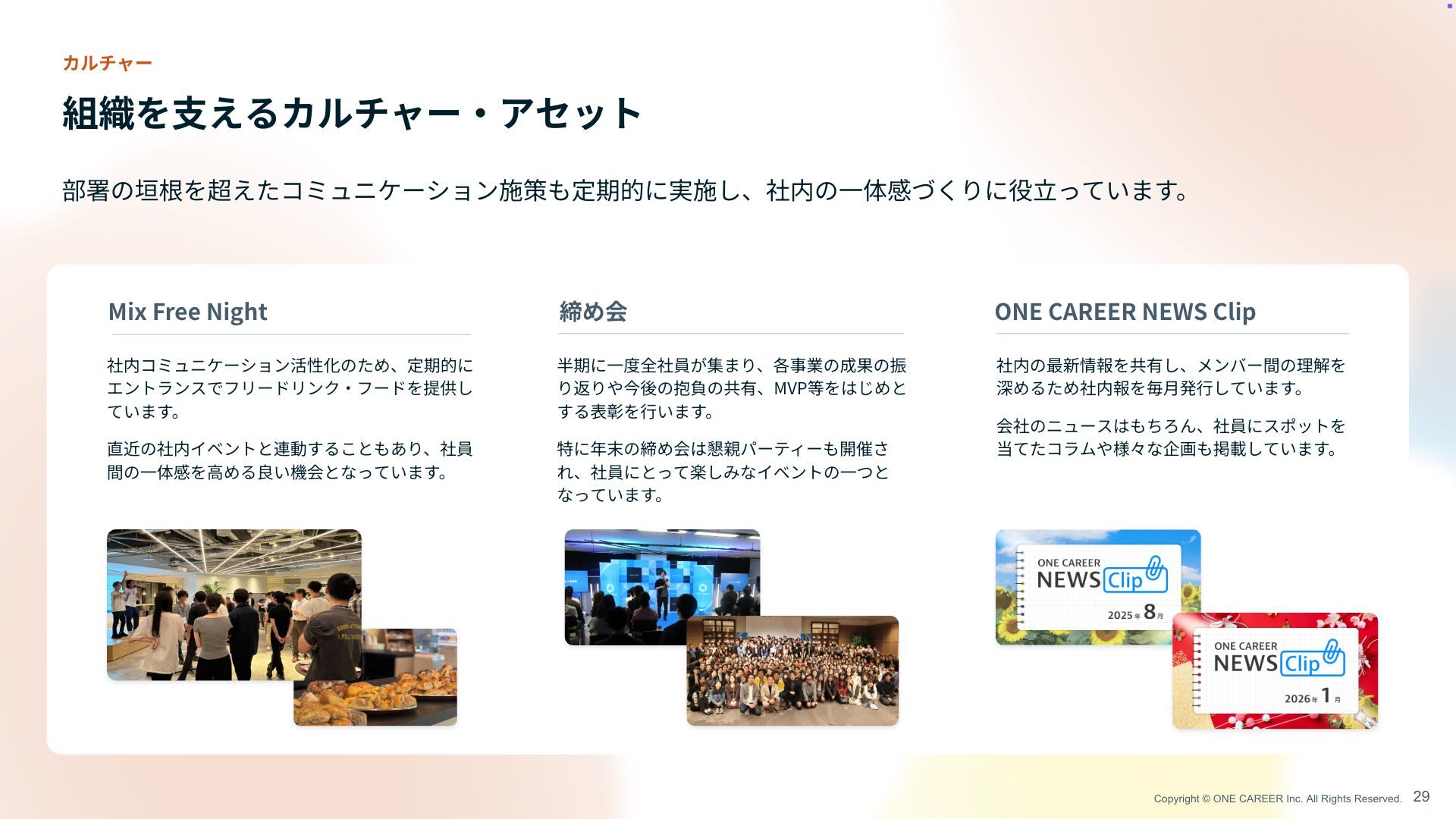 体感づくりに役 立 っています。 組織を 支 えるカルチャー ・ アセット 29 カルチャー Mix Free Night 締め会 ONE CAREER NEWS Clip 社内コミュニケーション活性化のため、定期的に エントランスでフリードリンク ・ フードを提供し ています。 直近の社内イベントと連動することもあり、社員 間の 一 体感を 高 める良い機会となっています。 半期に 一 度全社員が集まり、各事業の成果の振 り返りや今後の抱負の共有、MVP等をはじめと する表彰を 行 います。 特に年末の締め会は懇親パーティーも開催さ れ、社員にとって楽しみなイベントの 一 つとな っています。 社内の最新情報を共有し、メンバー間の理解を 深めるため社内報を毎 月 発 行 しています。 会社のニュースはもちろん、社員にスポットを 当てたコラムや様々な企画も掲載しています。