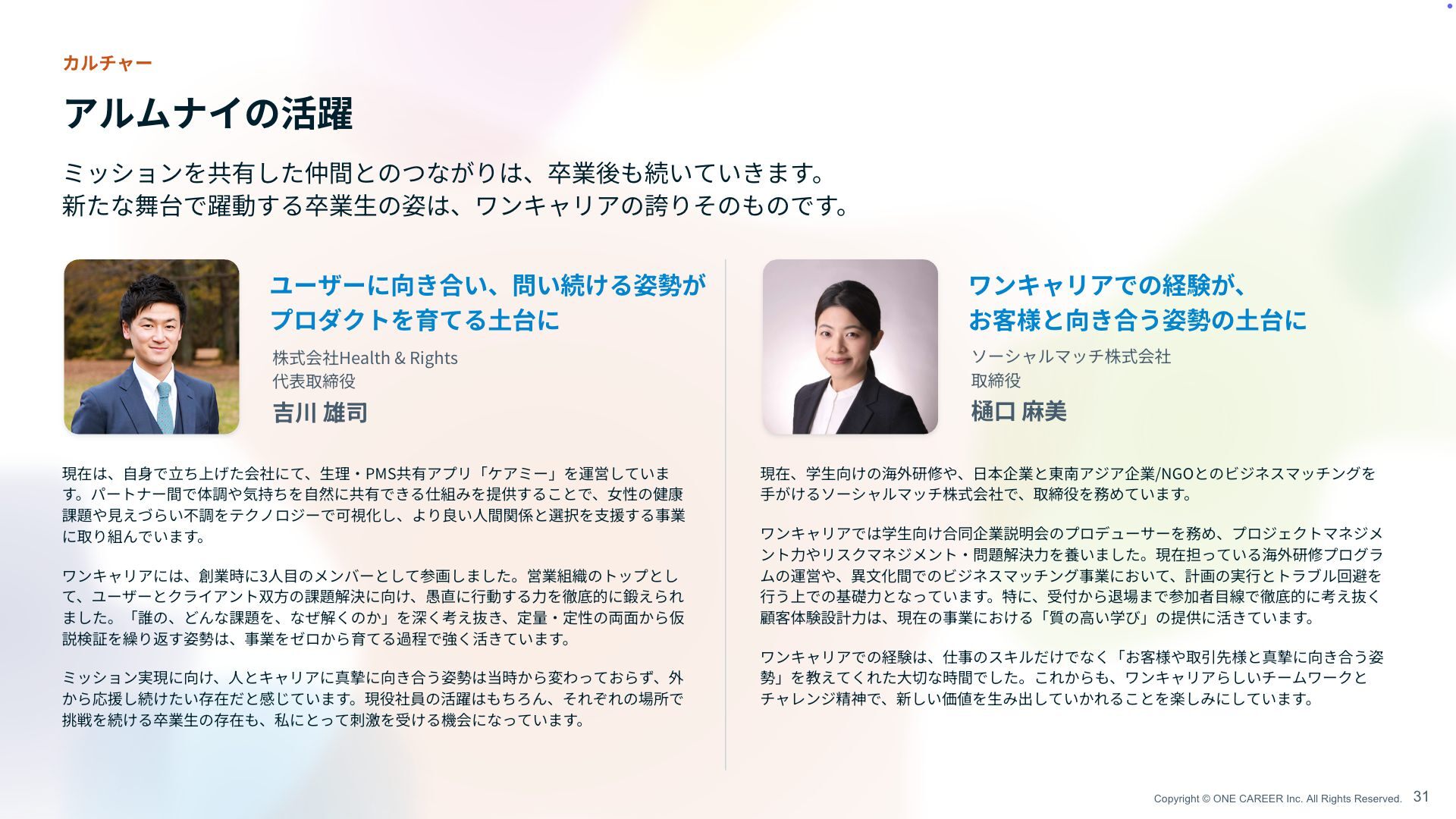 Rights 代表取締役 吉川 雄司 ユーザーに向き合い、問い続ける姿勢が プロダクトを育てる 土 台に 現在は、 自身 で 立 ち上げた会社にて、 生 理 ・ PMS共有アプリ「ケアミー」を運営していま す。パートナー間で体調や気持ちを 自 然に共有できる仕組みを提供することで、 女 性の健康 課題や 見 えづらい不調をテクノロジーで可視化し、より良い 人 間関係と選択を 支 援する事業 に取り組んでいます。 ワンキャリアには、創業時に3 人目 のメンバーとして参画しました。営業組織のトップとし て、ユーザーとクライアント双 方 の課題解決に向け、愚直に 行 動する 力 を徹底的に鍛えられ ました。「誰の、どんな課題を、なぜ解くのか」を深く考え抜き、定量 ・ 定性の両 面 から仮 説検証を繰り返す姿勢は、事業をゼロから育てる過程で強く活きています。 ミッション実現に向け、 人 とキャリアに真摯に向き合う姿勢は当時から変わっておらず、外 から応援し続けたい存在だと感じています。現役社員の活躍はもちろん、それぞれの場所で 挑戦を続ける卒業 生 の存在も、私にとって刺激を受ける機会になっています。 ミッションを共有した仲間とのつながりは、卒業後も続いていきます。 新たな舞台で躍動する卒業 生 の姿は、ワンキャリアの誇りそのものです。 31 カルチャー アルムナイの活躍 ソーシャルマッチ株式会社 取締役 樋 口 麻 美 ワンキャリアでの経験が、 お客様と向き合う姿勢の 土 台に 現在、学 生 向けの海外研修や、 日 本企業と東南アジア企業/NGOとのビジネスマッチングを 手 がけるソーシャルマッチ株式会社で、取締役を務めています。 ワンキャリアでは学 生 向け合同企業説明会のプロデューサーを務め、プロジェクトマネジメ ント 力 やリスクマネジメント ・ 問題解決 力 を養いました。現在担っている海外研修プログラ ムの運営や、異 文 化間でのビジネスマッチング事業において、計画の実 行 とトラブル回避を 行 う上での基礎 力 となっています。特に、受付から退場まで参加者 目 線で徹底的に考え抜く 顧客体験設計 力 は、現在の事業における「質の 高 い学び」の提供に活きています。 ワンキャリアでの経験は、仕事のスキルだけでなく「お客様や取引先様と真摯に向き合う姿 勢」を教えてくれた 大 切な時間でした。これからも、ワンキャリアらしいチームワークとチ ャレンジ精神で、新しい価値を 生 み出していかれることを楽しみにしています。