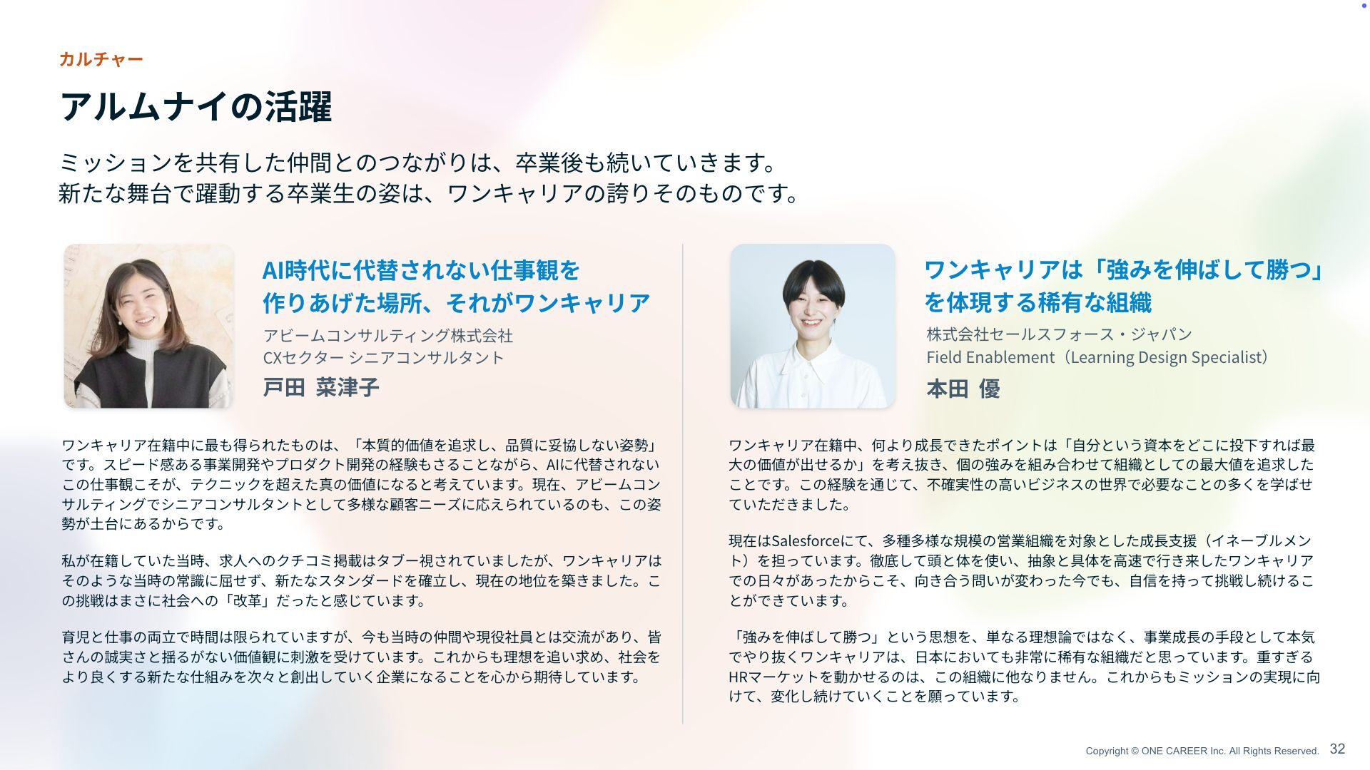 ジャパン Field Enablement(Learning Design Specialist) 本 田 優 ワンキャリアは「強みを伸ばして勝つ」 を体現する稀有な組織 ワンキャリア在籍中、何より成 長 できたポイントは「 自 分という資本をどこに投下すれば最 大 の価値が出せるか」を考え抜き、個の強みを組み合わせて組織としての最 大 値を追求した ことです。この経験を通じて、不確実性の 高 いビジネスの世界で必要なことの多くを学ばせて いただきました。 現在はSalesforceにて、多種多様な規模の営業組織を対象とした成 長支 援(イネーブルメン ト)を担っています。徹底して頭と体を使い、抽象と具体を 高 速で 行 き来したワンキャリア での 日 々があったからこそ、向き合う問いが変わった今でも、 自 信を持って挑戦し続けるこ とができています。 「強みを伸ばして勝つ」という思想を、単なる理想論ではなく、事業成 長 の 手 段として本気 でやり抜くワンキャリアは、 日 本においても 非 常に稀有な組織だと思っています。重すぎる HRマーケットを動かせるのは、この組織に他なりません。これからもミッションの実現に向 けて、変化し続けていくことを願っています。 アビームコンサルティング株式会社 CXセクター シニアコンサルタント 戸田 菜津 子 ワンキャリア在籍中に最も得られたものは、「本質的価値を追求し、品質に妥協しない姿勢」 です。スピード感ある事業開発やプロダクト開発の経験もさることながら、AIに代替されない この仕事観こそが、テクニックを超えた真の価値になると考えています。現在、アビームコン サルティングでシニアコンサルタントとして多様な顧客ニーズに応えられているのも、この姿 勢が 土 台にあるからです。 私が在籍していた当時、求 人 へのクチコミ掲載はタブー視されていましたが、ワンキャリアは そのような当時の常識に屈せず、新たなスタンダードを確 立 し、現在の地位を築きました。こ の挑戦はまさに社会への「改 革 」だったと感じています。 育児と仕事の両 立 で時間は限られていますが、今も当時の仲間や現役社員とは交流があり、皆 さんの誠実さと揺るがない価値観に刺激を受けています。これからも理想を追い求め、社会を より良くする新たな仕組みを次々と創出していく企業になることを 心 から期待しています。 AI時代に代替されない仕事観を 作りあげた場所、それがワンキャリア ミッションを共有した仲間とのつながりは、卒業後も続いていきます。 新たな舞台で躍動する卒業 生 の姿は、ワンキャリアの誇りそのものです。 32 カルチャー アルムナイの活躍
