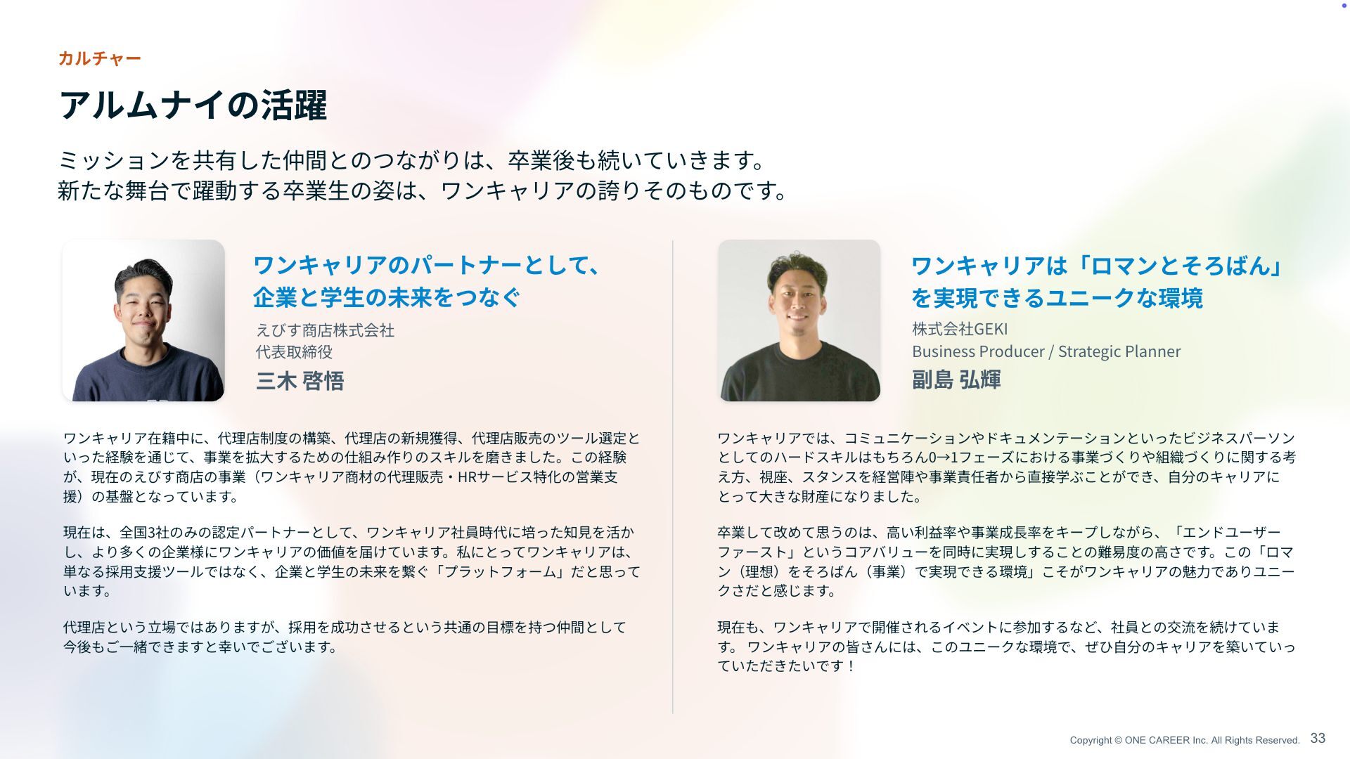 三 木 啓悟 ワンキャリアのパートナーとして、 企業と学 生 の未来をつなぐ ワンキャリア在籍中に、代理店制度の構築、代理店の新規獲得、代理店販売のツール選定と いった経験を通じて、事業を拡 大 するための仕組み作りのスキルを磨きました。この経験 が、現在のえびす商店の事業(ワンキャリア商材の代理販売 ・ HRサービス特化の営業 支 援)の基盤となっています。 現在は、全国3社のみの認定パートナーとして、ワンキャリア社員時代に培った知 見 を活か し、より多くの企業様にワンキャリアの価値を届けています。私にとってワンキャリアは、 単なる採 用支 援ツールではなく、企業と学 生 の未来を繋ぐ「プラットフォーム」だと思って います。 代理店という 立 場ではありますが、採 用 を成功させるという共通の 目 標を持つ仲間として 今後もご 一 緒できますと幸いでございます。 株式会社GEKI Business Producer / Strategic Planner 副島 弘輝 ワンキャリアでは、コミュニケーションやドキュメンテーションといったビジネスパーソン としてのハードスキルはもちろん0→1フェーズにおける事業づくりや組織づくりに関する考 え 方 、視座、スタンスを経営陣や事業責任者から直接学ぶことができ、 自 分のキャリアにと って 大 きな財産になりました。 卒業して改めて思うのは、 高 い利益率や事業成 長 率をキープしながら、「エンドユーザーフ ァースト」というコアバリューを同時に実現しすることの難易度の 高 さです。この「ロマン (理想)をそろばん(事業)で実現できる環境」こそがワンキャリアの魅 力 でありユニーク さだと感じます。 現在も、ワンキャリアで開催されるイベントに参加するなど、社員との交流を続けていま す。 ワンキャリアの皆さんには、このユニークな環境で、ぜひ 自 分のキャリアを築いていっ ていただきたいです! ワンキャリアは「ロマンとそろばん」 を実現できるユニークな環境 ミッションを共有した仲間とのつながりは、卒業後も続いていきます。 新たな舞台で躍動する卒業 生 の姿は、ワンキャリアの誇りそのものです。 33 カルチャー アルムナイの活躍