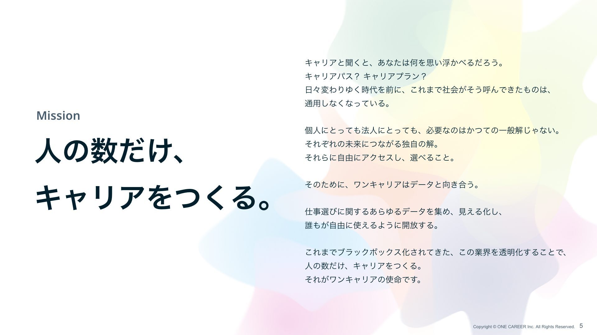 しなくなっている。 個 人 にとっても法 人 にとっても、必要なのはかつての 一 般解じゃない。 それぞれの未来につながる独 自 の解。 それらに 自 由にアクセスし、選べること。 そのために、ワンキャリアはデータと向き合う。 仕事選びに関するあらゆるデータを集め、 見 える化し、 誰もが 自 由に使えるように開放する。 これまでブラックボックス化されてきた、この業界を透明化することで、 人 の数だけ、キャリアをつくる。 それがワンキャリアの使命です。 Copyright © ONE CAREER Inc. All Rights Reserved. 5 5