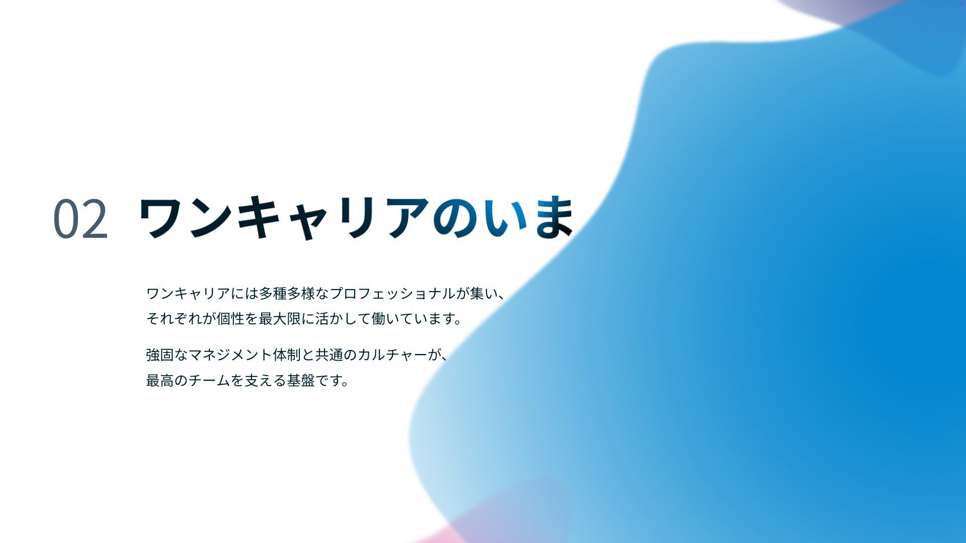 0 2 ワンキャリアには多種多様なプロフェッショナルが集い、 それぞれが個性を最 大 限に活かして働いています。 強固なマネジメント体制と共通のカルチャーが、 最 高
