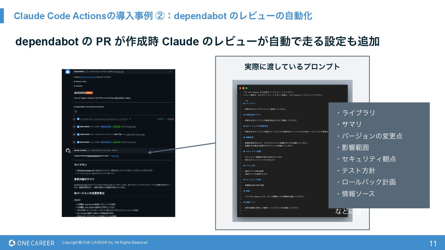 Actionsͷಋೖࣄྫ ᶄɿdependabot ͷϨϏϡʔͷࣗಈԽ 11 dependabot ͷ PR ͕࡞࣌ Claude ͷϨϏϡʔ͕ࣗಈͰΔઃఆՃ ɾϥΠϒϥϦ ɾαϚϦ ɾόʔδϣϯͷมߋ ɾӨڹൣғ ɾηΩϡϦςΟ؍ ɾςετํ ɾϩʔϧόοΫܭը ɾใιʔε ͳͲʹண͢ΔΑ͏ʹࢦࣔ ࣮ࡍʹ͍ͯ͠Δϓϩϯϓτ