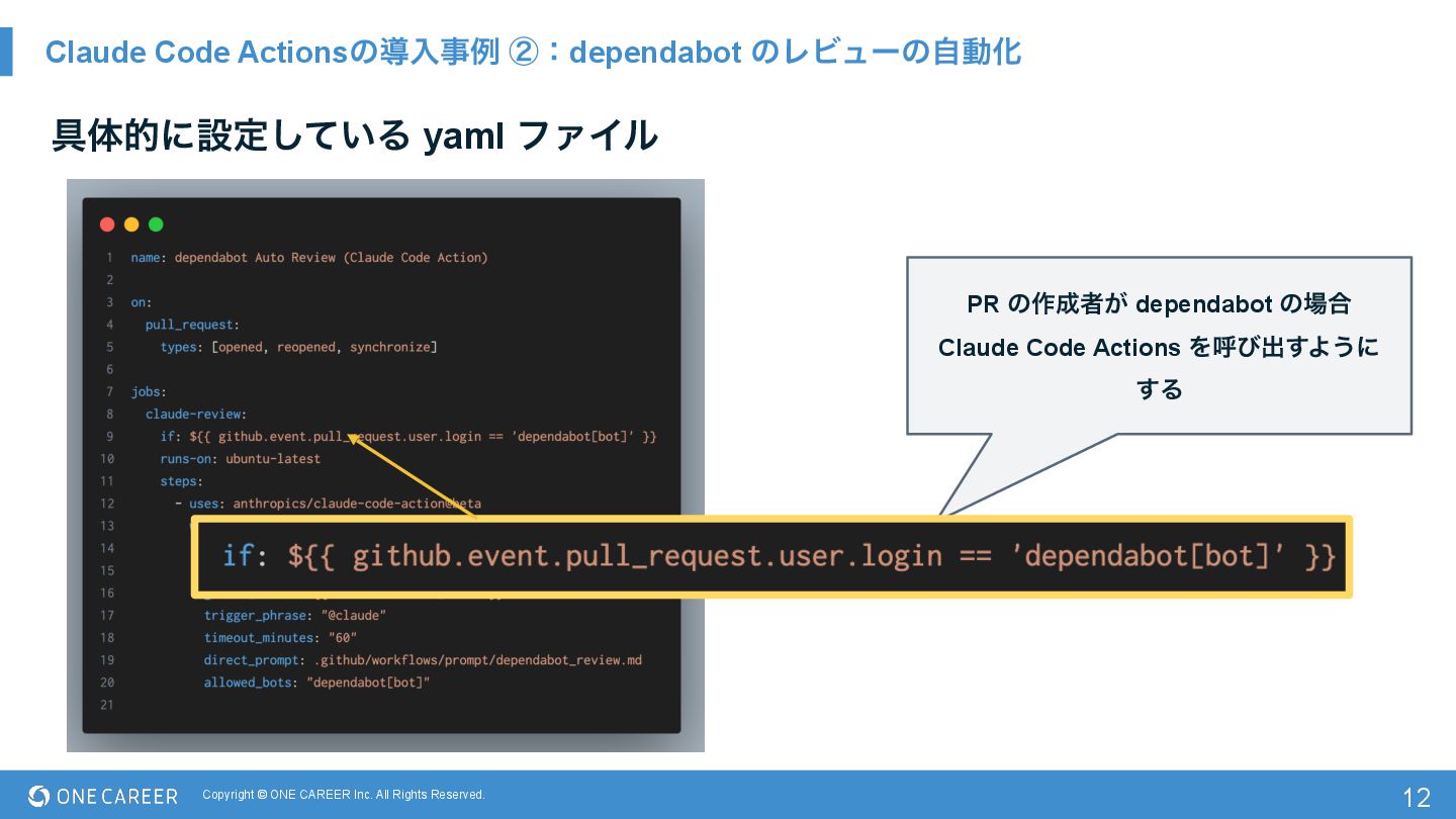 Actionsͷಋೖࣄྫ ᶄɿdependabot ͷϨϏϡʔͷࣗಈԽ 12 ۩ମతʹઃఆ͍ͯ͠Δ yaml ϑΝΠϧ PR ͷ࡞ऀ͕ dependabot ͷ߹ Claude Code Actions Λݺͼग़͢Α͏ʹ ͢Δ