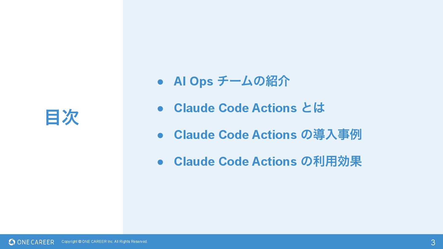 • AI Ops νʔϜͷհ • Claude Code Actions ͱ • Claude Code Actions ͷಋೖࣄྫ • Claude Code Actions ͷར༻ޮՌ