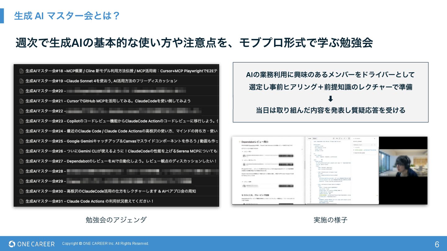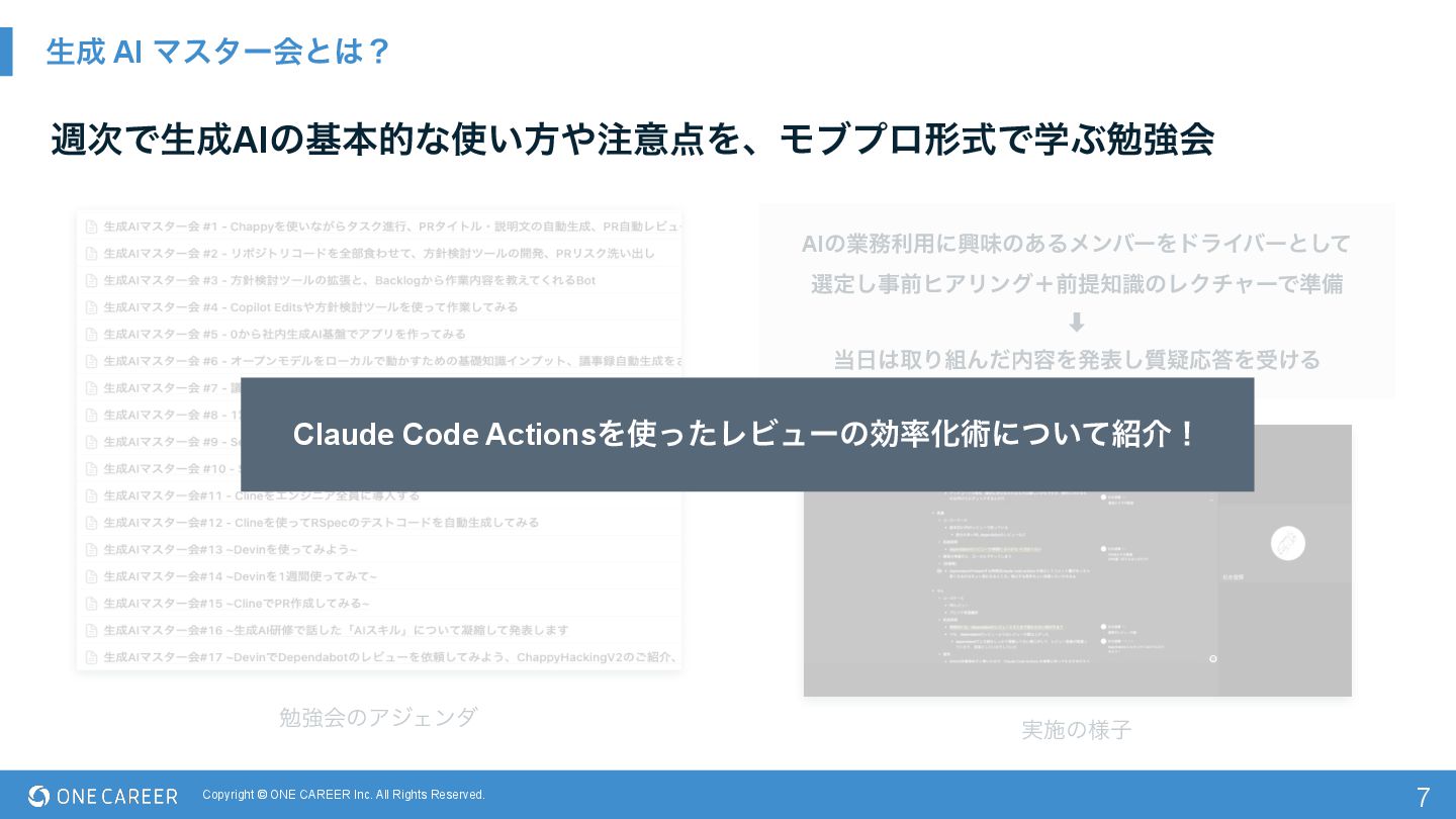 Ϛελʔձͱʁ 7 ि࣍ͰੜAIͷجຊతͳ͍ํҙΛɺϞϒϓϩܗࣜͰֶͿษڧձ AIͷۀར༻ʹڵຯͷ͋ΔϝϯόʔΛυϥΠόʔͱͯ͠ બఆ͠ࣄલώΞϦϯάʴલఏࣝͷϨΫνϟʔͰ४උ ⬇︎ औΓΜͩ༰Λൃද࣭ٙ͠ԠΛड͚Δ ࣮ࢪͷ༷ࢠ ษڧձͷΞδΣϯμ Claude Code ActionsΛͬͨϨϏϡʔͷޮԽज़ʹ͍ͭͯհʂ