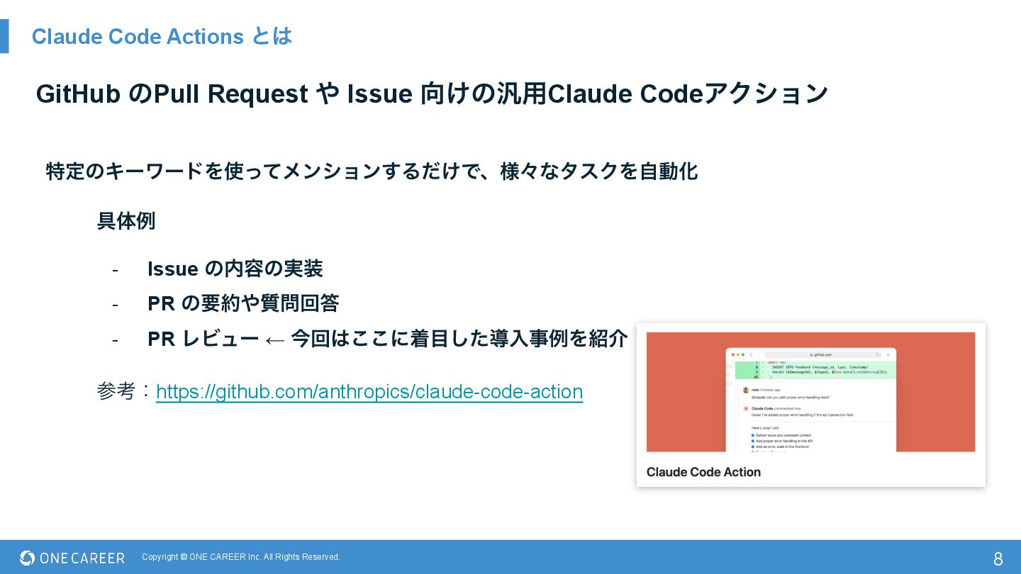 Actions ͱ 8 GitHub ͷPull Request Issue ͚ͷ൚༻Claude CodeΞΫγϣϯ ಛఆͷΩʔϫʔυΛͬͯϝϯγϣϯ͢Δ͚ͩͰɺ༷ʑͳλεΫΛࣗಈԽ ۩ମྫ - Issue ͷ༰ͷ࣮ - PR ͷཁ࣭ճ - PR ϨϏϡʔ ← ࠓճ͜͜ʹணͨ͠ಋೖࣄྫΛհ ࢀߟɿhttps://github.com/anthropics/claude-code-action