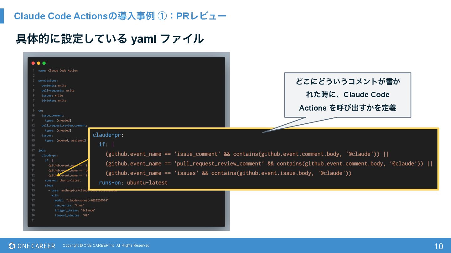 Actionsͷಋೖࣄྫ ᶃɿPRϨϏϡʔ 10 ۩ମతʹઃఆ͍ͯ͠Δ yaml ϑΝΠϧ Ͳ͜ʹͲ͏͍͏ίϝϯτ͕ॻ͔ Εͨ࣌ʹɺClaude Code Actions Λݺͼग़͔͢Λఆٛ
