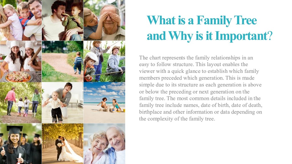 follow structure. This layout enables the viewer with a quick glance to establish which family members preceded which generation. This is made simple due to its structure as each generation is above or below the preceding or next generation on the family tree. The most common details included in the family tree include names, date of birth, date of death, birthplace and other information or data depending on the complexity of the family tree. What is a Family Tree and Why is it Important?