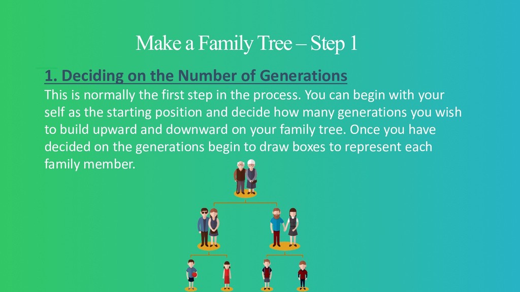 the Number of Generations This is normally the first step in the process. You can begin with your self as the starting position and decide how many generations you wish to build upward and downward on your family tree. Once you have decided on the generations begin to draw boxes to represent each family member.