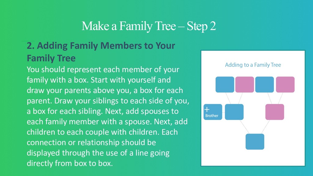 Members to Your Family Tree You should represent each member of your family with a box. Start with yourself and draw your parents above you, a box for each parent. Draw your siblings to each side of you, a box for each sibling. Next, add spouses to each family member with a spouse. Next, add children to each couple with children. Each connection or relationship should be displayed through the use of a line going directly from box to box.