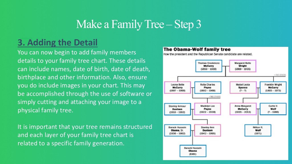 Detail You can now begin to add family members details to your family tree chart. These details can include names, date of birth, date of death, birthplace and other information. Also, ensure you do include images in your chart. This may be accomplished through the use of software or simply cutting and attaching your image to a physical family tree. It is important that your tree remains structured and each layer of your family tree chart is related to a specific family generation.