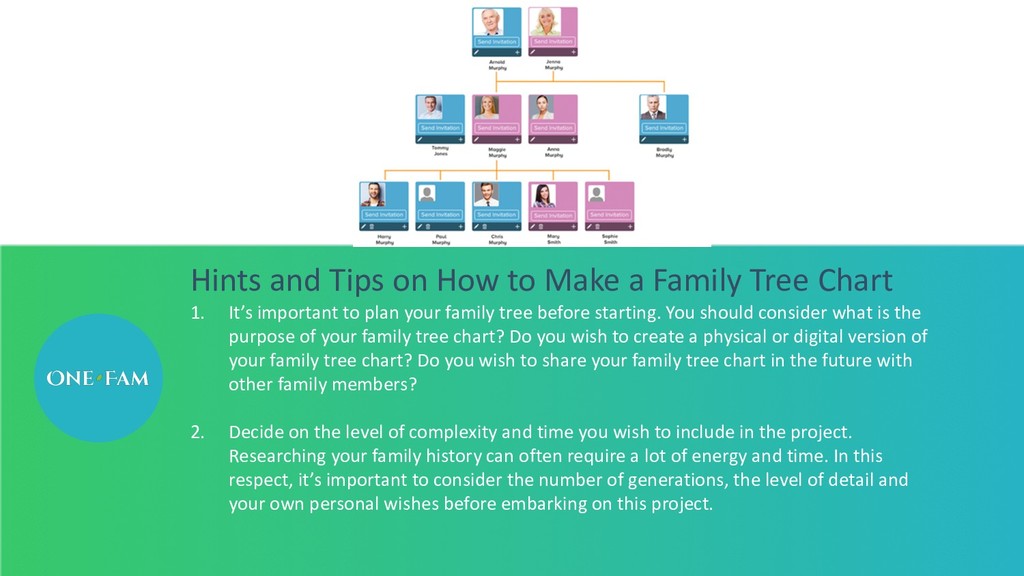 Chart 1. It’s important to plan your family tree before starting. You should consider what is the purpose of your family tree chart? Do you wish to create a physical or digital version of your family tree chart? Do you wish to share your family tree chart in the future with other family members? 2. Decide on the level of complexity and time you wish to include in the project. Researching your family history can often require a lot of energy and time. In this respect, it’s important to consider the number of generations, the level of detail and your own personal wishes before embarking on this project.
