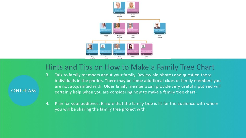 Chart 3. Talk to family members about your family. Review old photos and question those individuals in the photos. There may be some additional clues or family members you are not acquainted with. Older family members can provide very useful input and will certainly help when you are considering how to make a family tree chart. 4. Plan for your audience. Ensure that the family tree is fit for the audience with whom you will be sharing the family tree project with.
