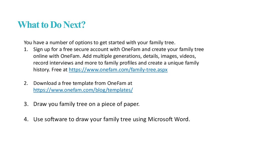 to get started with your family tree. 1. Sign up for a free secure account with OneFam and create your family tree online with OneFam. Add multiple generations, details, images, videos, record interviews and more to family profiles and create a unique family history. Free at https://www.onefam.com/family-tree.aspx 2. Download a free template from OneFam at https://www.onefam.com/blog/templates/ 3. Draw you family tree on a piece of paper. 4. Use software to draw your family tree using Microsoft Word.