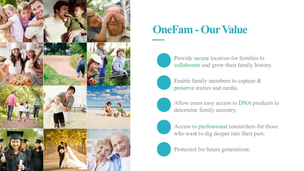 for those who want to dig deeper into their past. • Allow users easy access to DNA products to determine family ancestry. • Enable family members to capture & preserve stories and media. OneFam-Our Value • Provide secure location for families to collaborate and grow their family history.