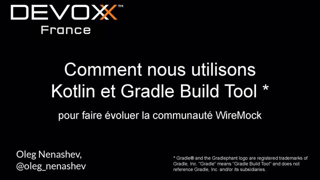 Dans cette présentation, je vais expliquer comment nous utilisons et prévoyons d'utiliser Kotlin et Gradle Build Tool pour améliorer la productivité des développeurs. Nous allons discuter de Kotlin DSL pour WireMock, des Gradle Build Tool convention plugins pour le logiciel de builds partagés, du développement d'extensions de WireMock en Kotlin et de ses DSL bindings. Je vais utiliser les exemples de WireMock qui sont open source et disponibles sur GitHub.