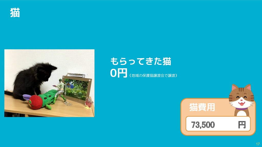17 もらってきた猫 0円 (地域の保護猫譲渡会で譲渡) 猫費用 73,500 円 猫
