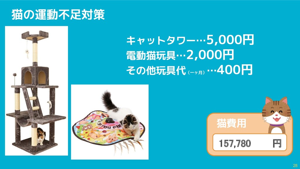 28 猫費用 157,780 円 猫の運動不足対策 キャットタワー…5,000円 電動猫玩具…2,000円 その他玩具代 (一ヶ月) …400円
