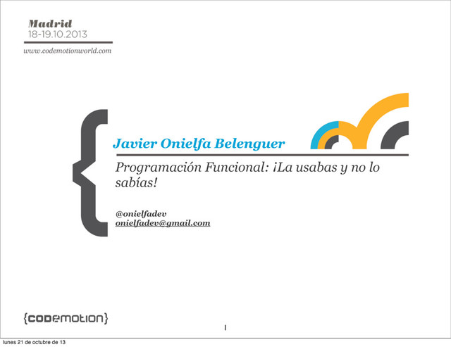 La programación funcional está influenciando frameworks y lenguajes. En esta charla se explicará programación funcional, usando Haskell y sus conceptos como transparencia referencial, inmutabilidad, ausencia de estado, recursión, list comprehension, monads y lazy evaluation. Finalmente se verá como estos conceptos ya los estáis utilizando como Javascript, promesas, LINQ, excepciones, Java 8 o Map/Reduce. Verás nuevos patrones donde antes solo había código espagueti.