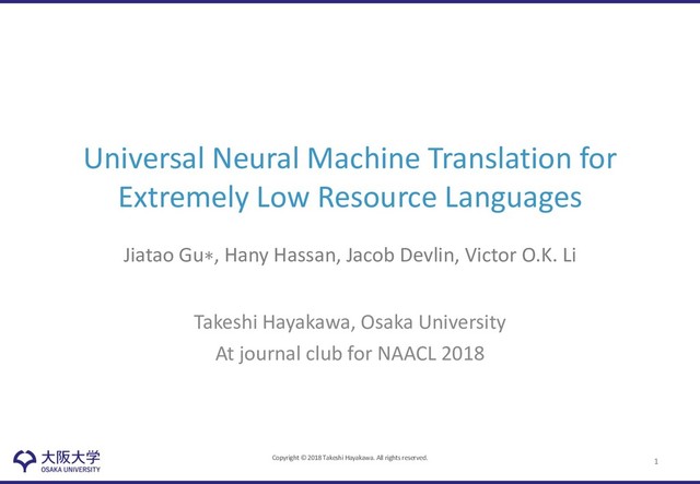 Machine Translation for Extremely Low Resource Languages Jiatao Gu∗, Hany Hassan, Jacob Devlin, Victor O.K. Li Takeshi Hayakawa, Osaka University At journal club for NAACL 2018 1