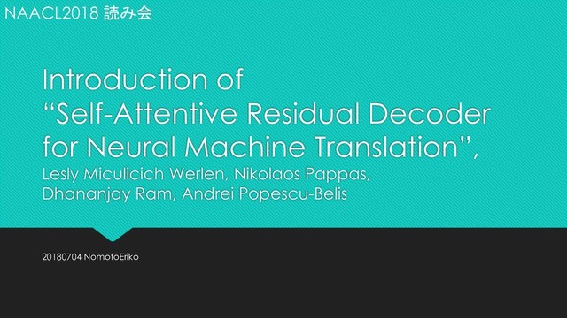based on the sequence model Proposed method Øtarget-side-attentive residual recurrent network for decoding result Øthe method improved the translation without increasing the number of parameters Summary Improve translation without complicated calculation 3
