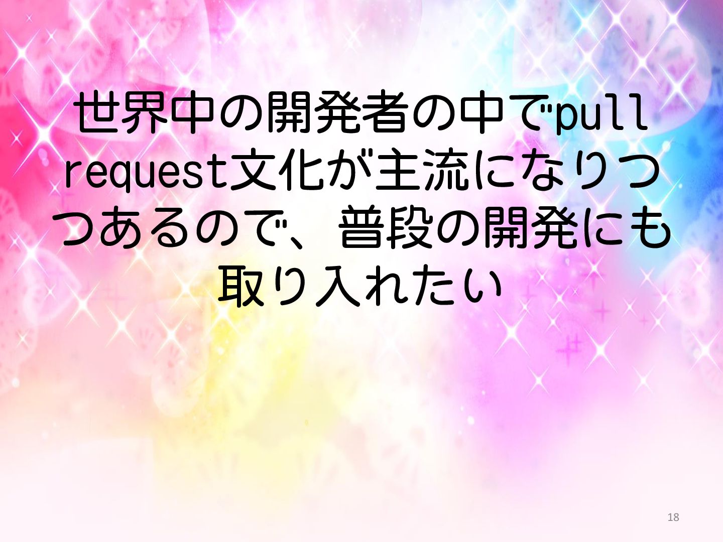 世界中の開発者の中でpull request文化が主流になりつ つあるので、普段の開発にも 取り入れたい 18