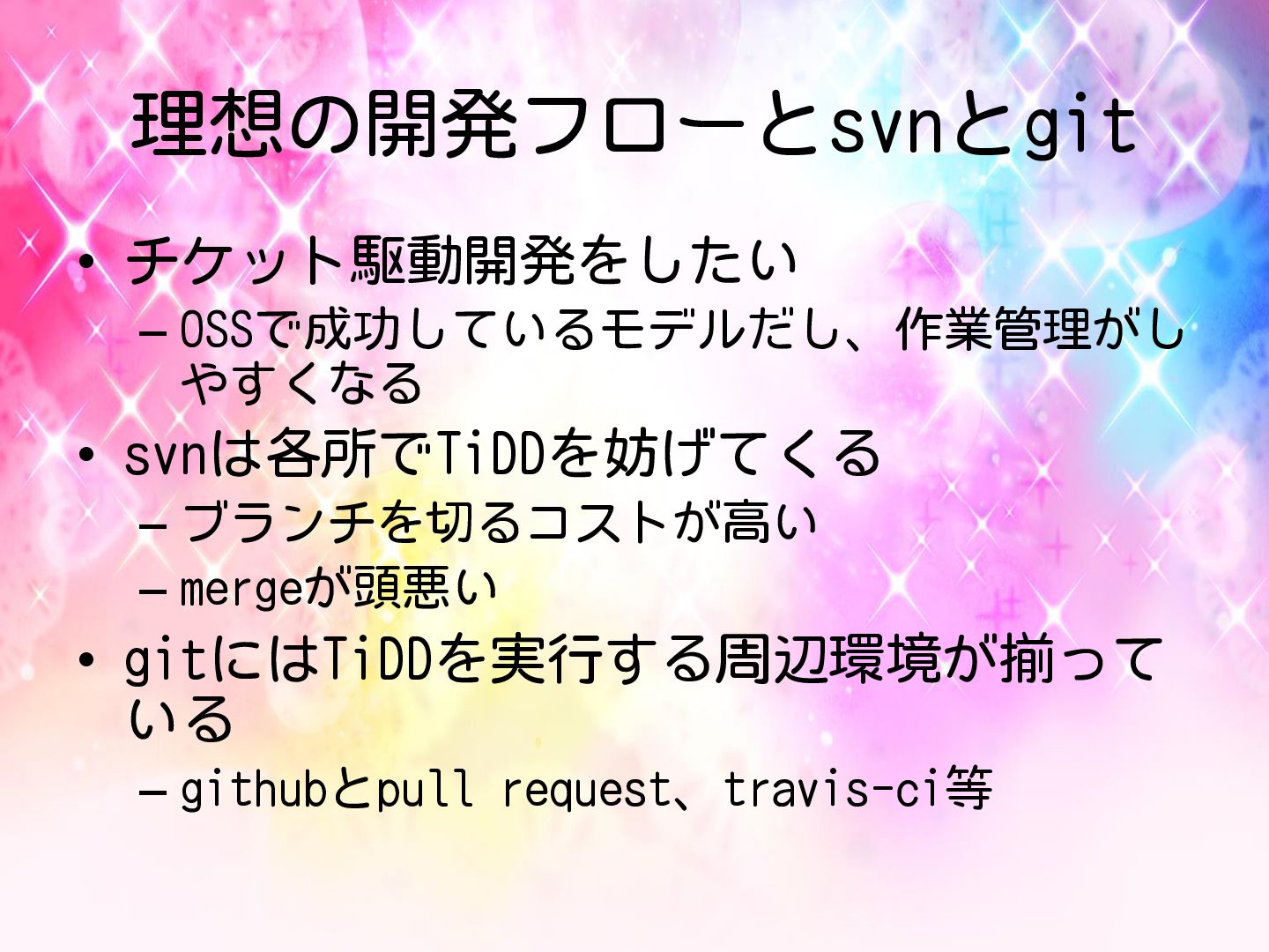 理想の開発フローとsvnとgit • チケット駆動開発をしたい – OSSで成功しているモデルだし、作業管理がし やすくなる • svnは各所でTiDDを妨げてくる – ブランチを切るコストが高い