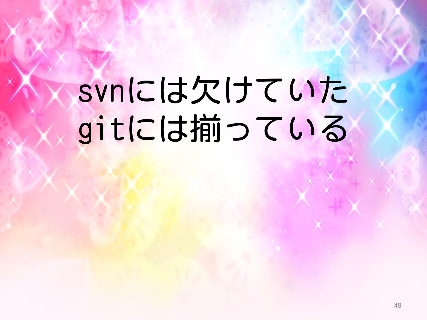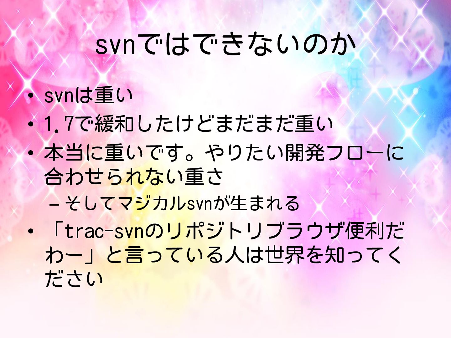 svnではできないのか • svnは重い • 1.7で緩和したけどまだまだ重い • 本当に重いです。やりたい開発フローに 合わせられない重さ – そしてマジカルsvnが生まれる