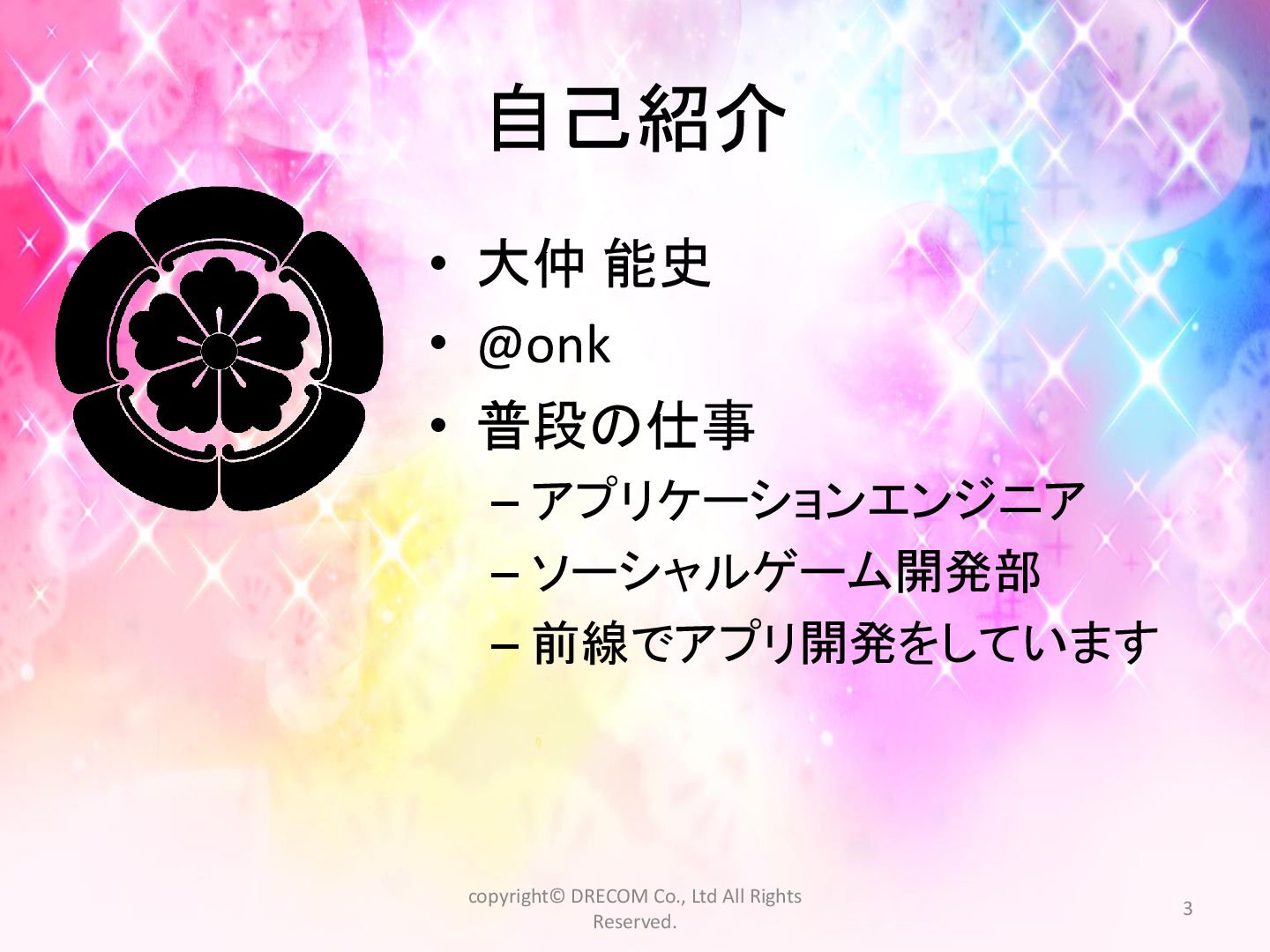 – ソーシャルゲーム開発部 – 前線でアプリ開発をしています copyright© DRECOM Co., Ltd All Rights Reserved. 3