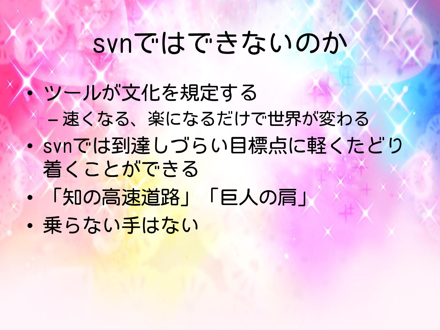 svnではできないのか • ツールが文化を規定する – 速くなる、楽になるだけで世界が変わる • svnでは到達しづらい目標点に軽くたどり 着くことができる • 「知の高速道路」「巨人の肩」