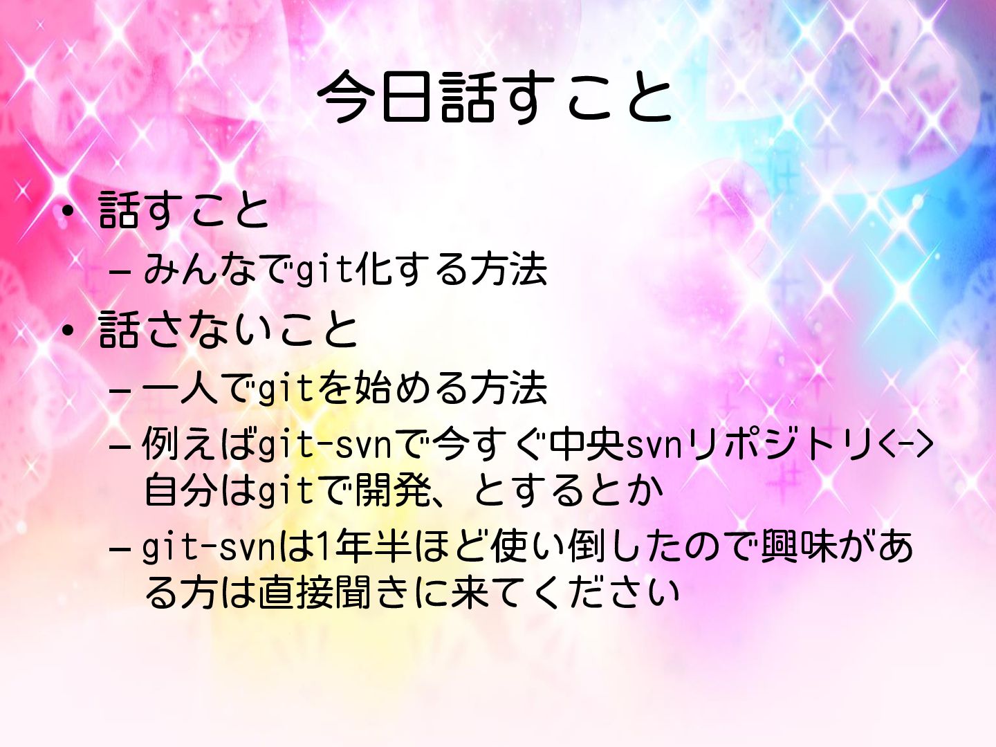 例えばgit-svnで今すぐ中央svnリポジトリ<-> 自分はgitで開発、とするとか – git-svnは1年半ほど使い倒したので興味があ る方は直接聞きに来てください
